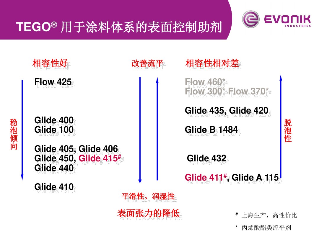 代表產品:迪高450流平劑(不影響重涂性)、迪高410(高滑爽度流平劑)、迪高482抗粘性流平劑。