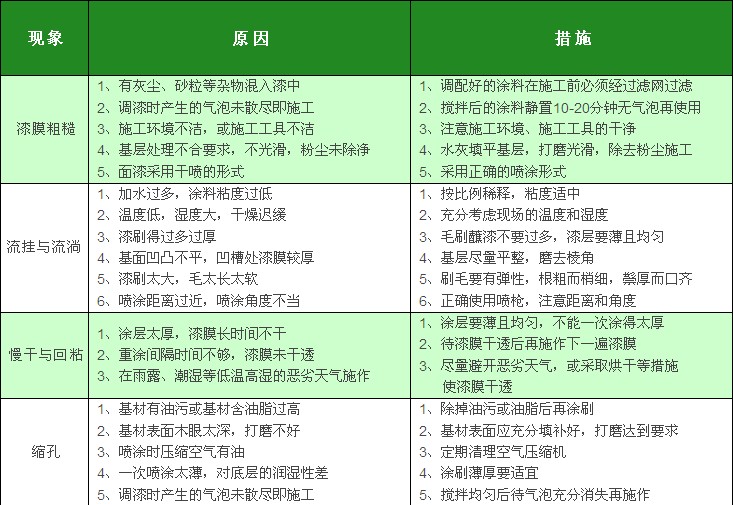 三升水潤水性木器漆性能優異,但是如果在涂裝、儲存等過程中不當操作,有可能會引起一些問題,具體包括:漆膜粗糙、流掛與流淌、慢干與回粘、縮孔、氣泡、龜裂、黃變、橘皮、咬底等常見漆病。以下對常見的漆病做介紹 :