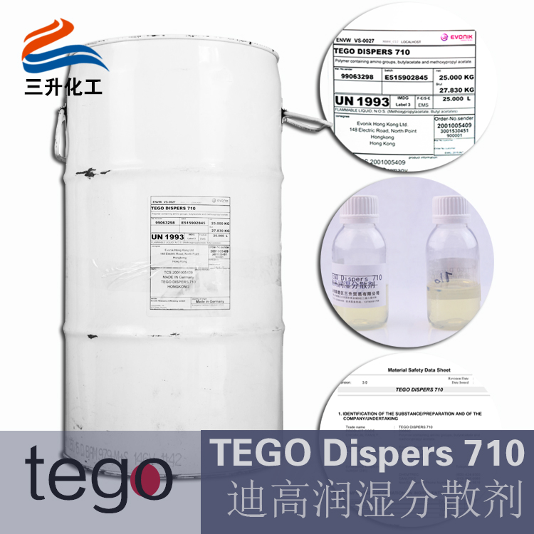 以下為三升貿易暢銷產品,贏創德固賽迪高助劑涂料潤濕分散劑的TEGO Dispers 710,用于溶劑型體系的潤濕分散劑,特別適用于顏料濃縮漿和共研磨(含樹脂)。