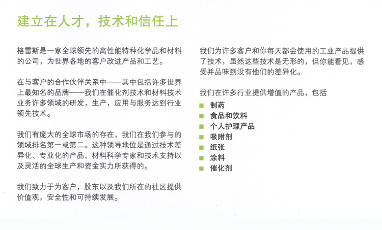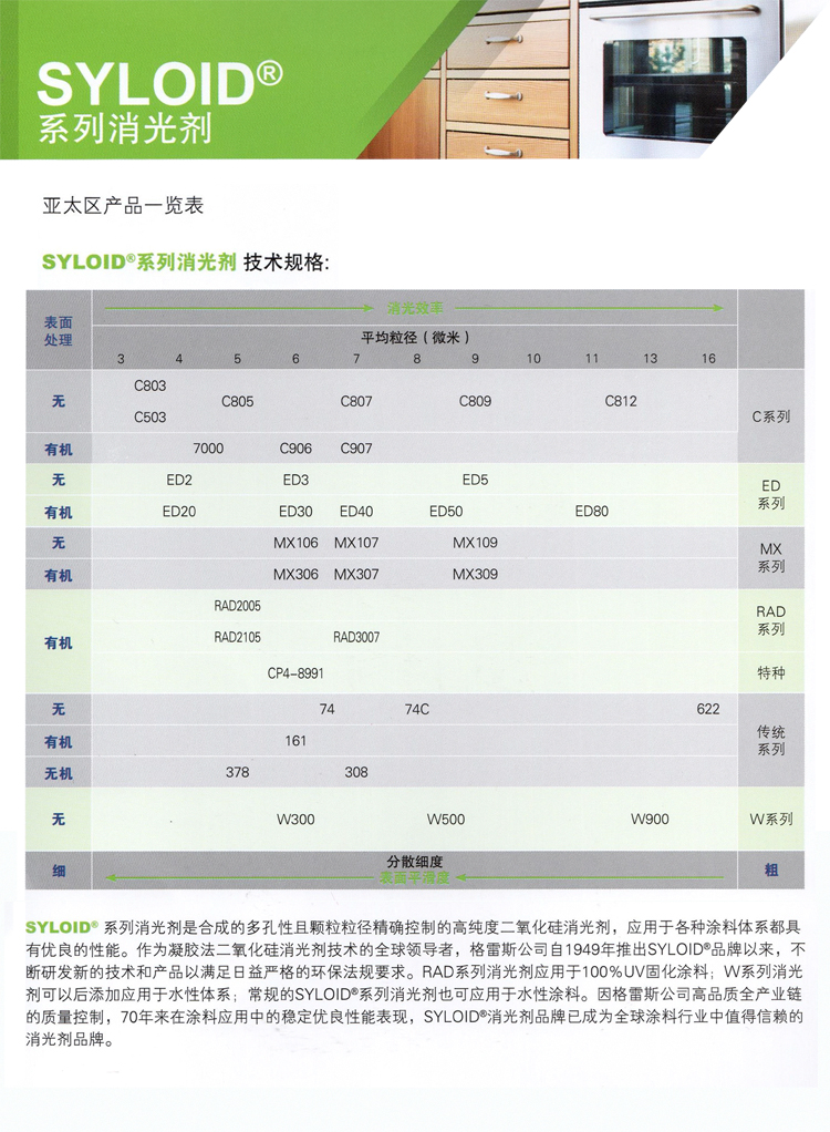 SYLOID系列消光劑是合成的多孔性且顆粒粒徑精確控制的高純度二氧化硅消光劑,應用于各種涂料體系都具有優良的性能。作為凝膠法二氧化硅消光劑技術的全球領導者,格雷斯公司自1949年推出SYLOID品牌以來,不斷研發新的技術和產品以滿足8益嚴格的環保法規要求。RAD系列消光劑應用于100%UV固化涂料: W系列消光劑可以后添加應用于水性體系:常規的SYLOID系列消光劑也可應用于水性涂料。因格雷斯公司高品質全產業鏈的質量控制,70年來在涂料應用中的穩定優良性能表現,SYLOID消光 劑品牌已成為全球涂料行業中值得信賴的消光劑品牌。