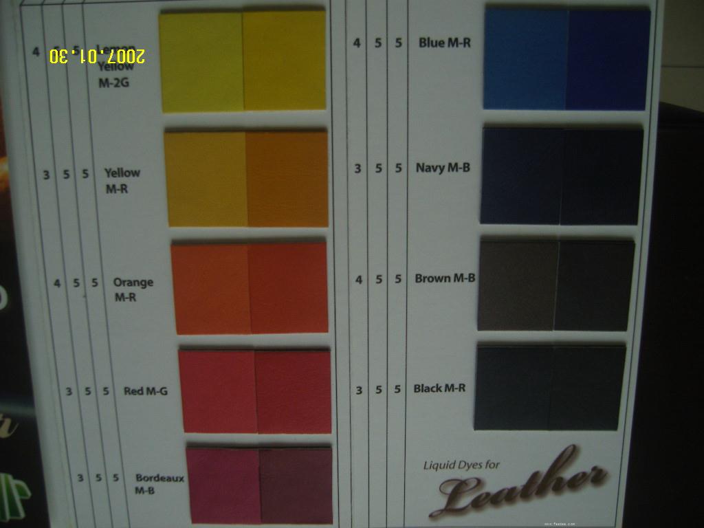 皮革水性染料色精:金屬絡(luò)合染料色精液體有良好親水性,相容性,色彩艷麗適合皮革侵染,噴染涂飾。進(jìn)口水性色精采用復(fù)合型金屬絡(luò)合配方。游離重金屬符合國(guó)際標(biāo)準(zhǔn)。國(guó)家SGS環(huán)保檢測(cè)認(rèn)證。